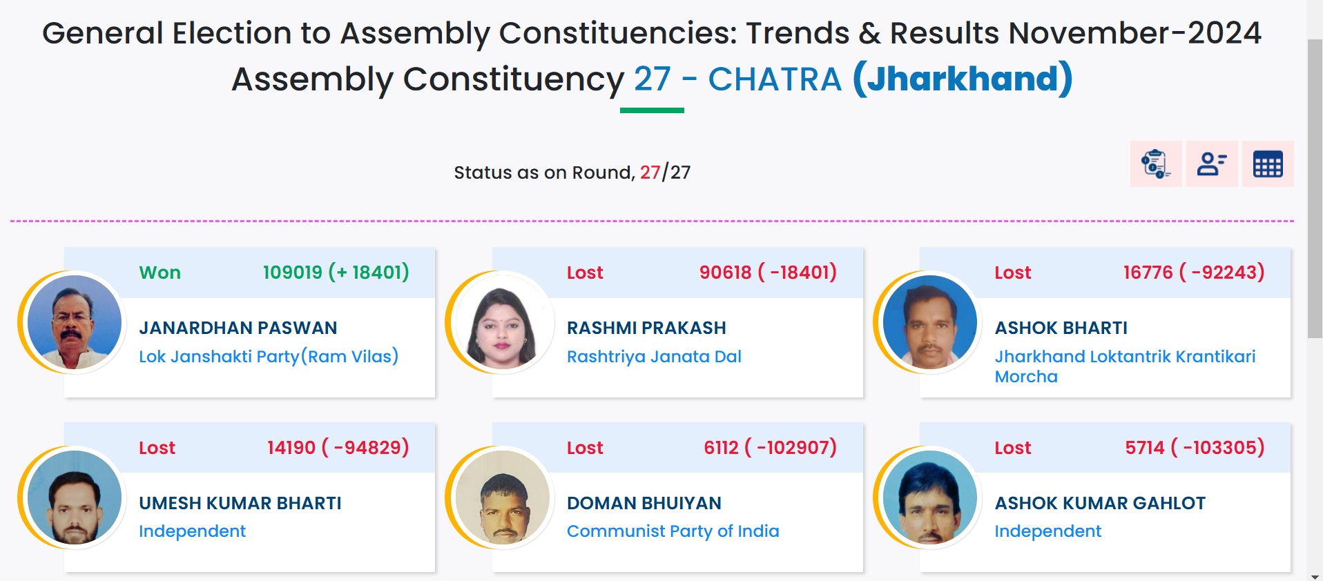 Chatra vidhan sabha Chunav Result झारखंड की चतरा सीट पर लोजपा के जनार्दन पासवान ने 18 हजार से ज्यादा वोटों से जीत दर्ज करके इतिहास रच दिया है। उनके सामने मैदान ने में उतरी राजद की रश्मि प्रकाश को हार का सामना करना पड़ा है। वहीं झारखंड लोकतांत्रिक क्रांतिकारी मोर्चा के अशोक भारती तीसरे स्थान पर रहे। आगे विस्तार से पढ़िए पूरा अपडेट।