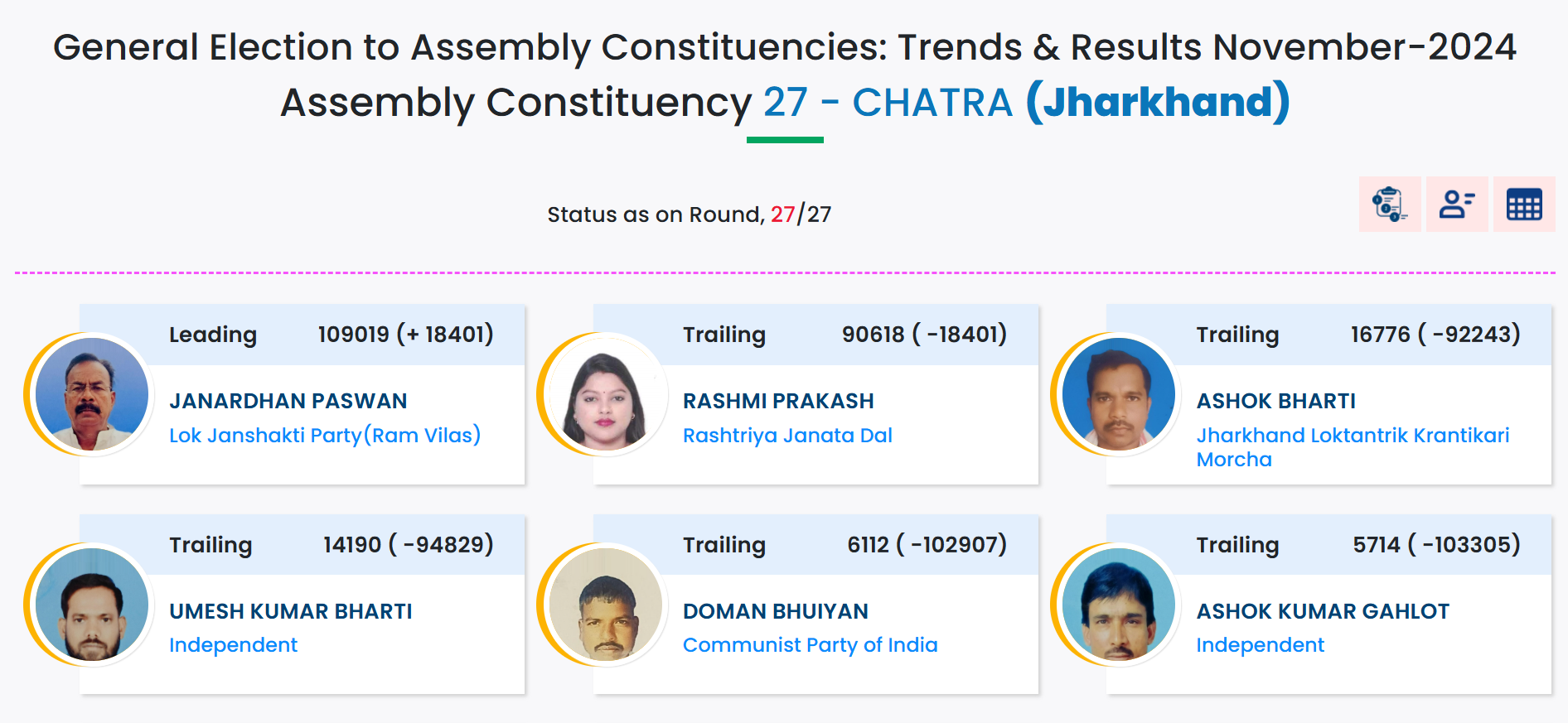 लोक जनशक्ति पार्टी (रामविलास) ने चतरा विधानसभा से जनार्दन पासवान को उतारा। जनार्दन पासवान को 27 राउंड की गिनती के बाद 109019 वोट हासिल किए। वह राष्ट्रीय जनता दल की रश्मि प्रकाश से 18 हजार 401 वोटों से आगे रहे। इस सीट पर तीसरे नंबर पर झारखंड लोकतात्रिंक क्रांतिकारी मोर्चा के अशोक भारती रहे। उन्हें 16 हजार के करीब मत मिले।