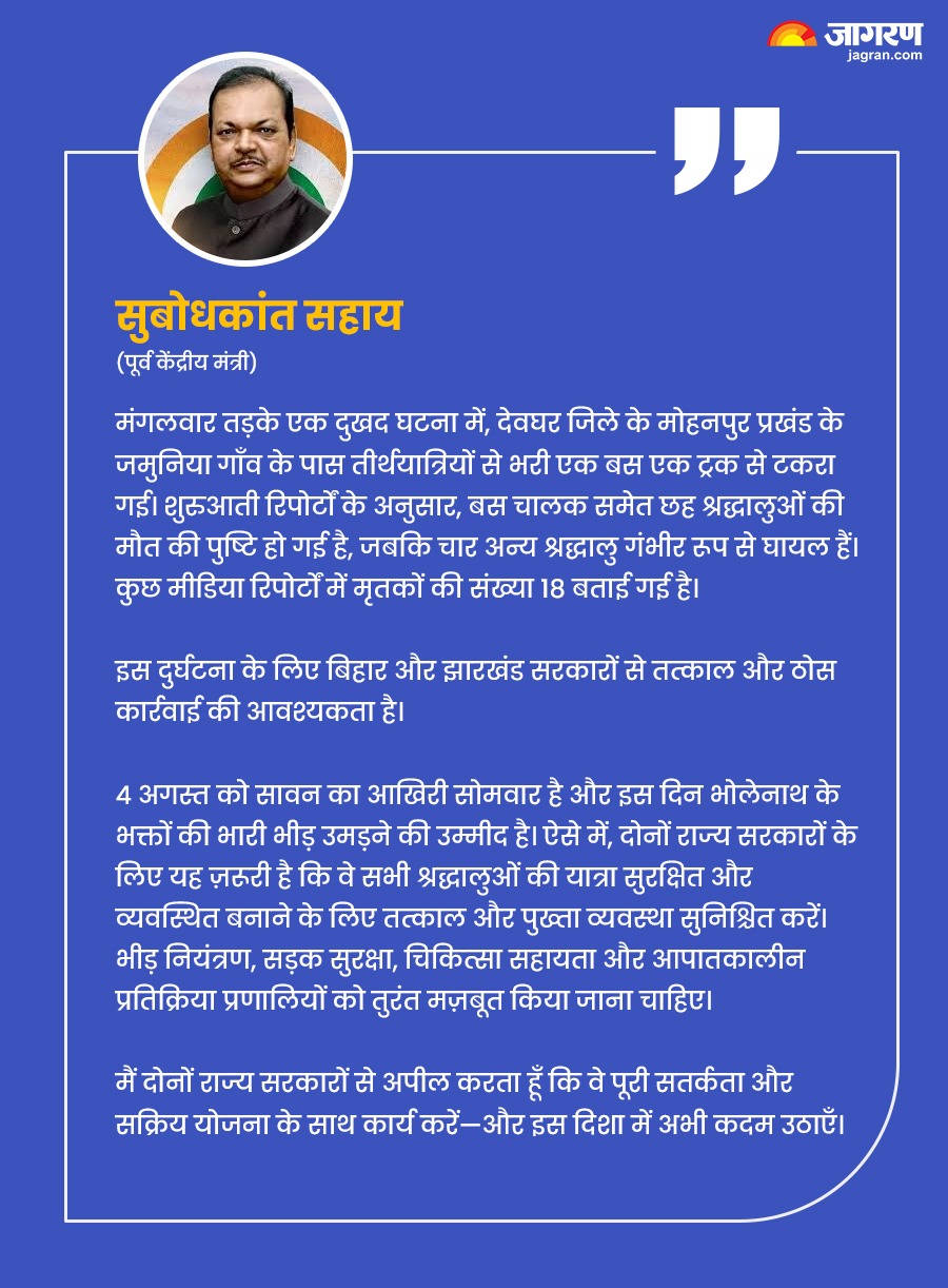 देवघर से बासुकीनाथ जा रही कांवरियों की बस दुर्घटना में कई श्रद्धालुओं के निधन का समाचार अत्यंत दुखद एवं पीड़ादायक है।
