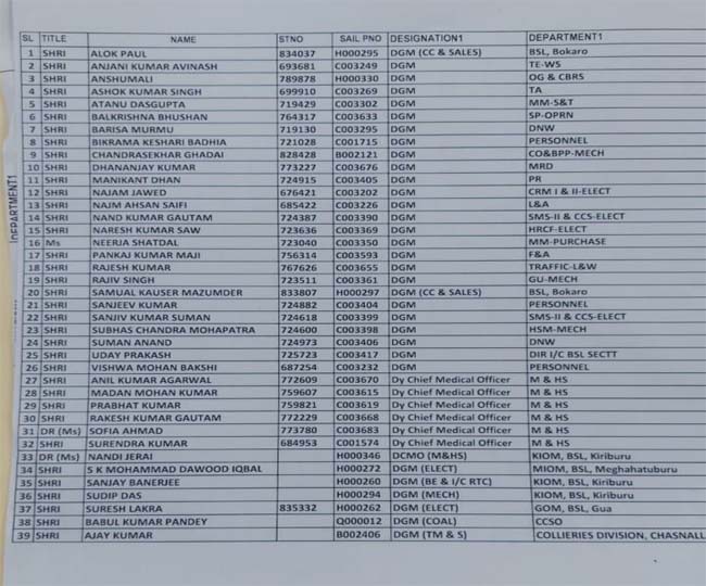 नव प्रौन्नत अधिकारियों में कई का तबादला भी किया गया है। बोकारो इस्पात संयंत्र में संचार प्रमुख मणिकांत धान, बीएसओए के अध्यक्ष एके सिंह व बीजीएच कोविड-19 के नोडल पदाधिकारी डा आरके गौतम को भी ई-6 से ई-7 ग्रेड में पदोन्नति दिया गया है।