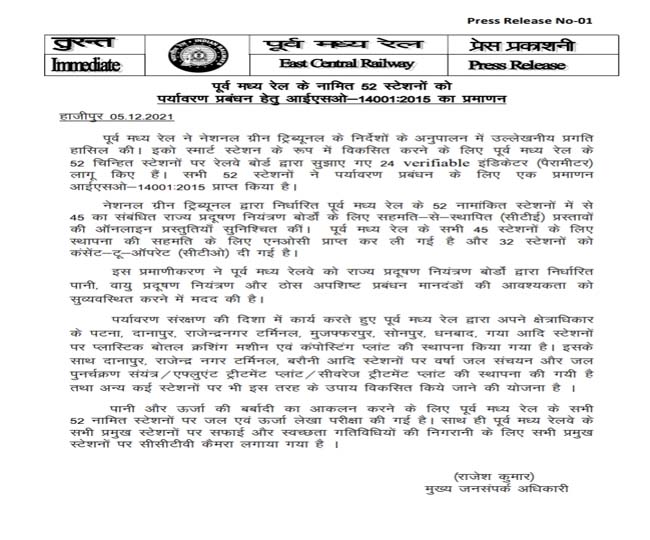 East Central Railway पर्यावरण संरक्षण की दिशा में काम करते हुए पूर्व मध्य रेल ने अपने क्षेत्राधिकार के धनबाद पटना दानापुर राजेंद्रनगर टर्मिनल मुजफ्फरप ...और पढ़ें
