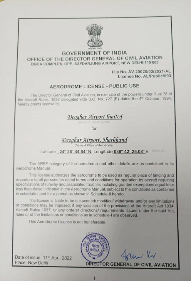 जागरण संवाददाता, धनबाद/देवघर: बाबानगरी देवघर समेत पूरे राज्य के लिए अच्छी खबर है। देवघर में नवनिर्मित हवाई अड्डे को डायरेक्टर जनरल ऑफ सिविल एविएशन (डीजीसीए) की ओर से व्यावसायिक उड़ानें शुरू करने के लिए एरोड्रोम लाइसेंस मिल चुका है। 11 अप्रैल को ऑफिस ऑफ द डायरेक्टर जनरल ऑफ सिविल एविएशन की ओर से यह लाइसेंस जारी किया गया।