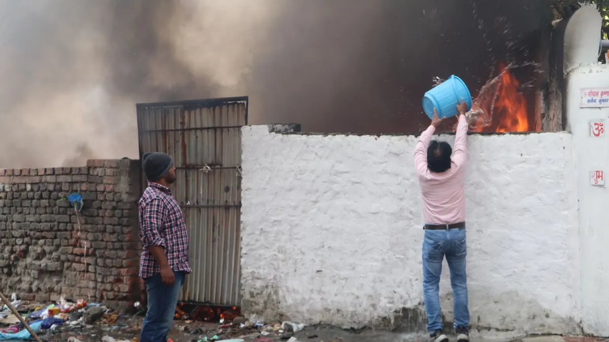 कचरा गोदाम में लगी आग और पानी डालते स्थानीय लोग। फोटो जागरण