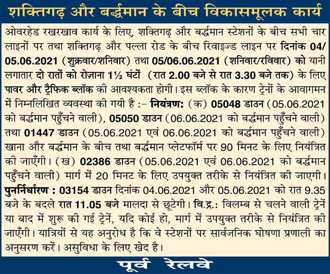 पूर्व रेलवे ने बताया है कि शक्तिगढ़ और बर्द्धमान स्टेशन के बीच सभी चार लाइन और शक्तिगढ़ और पल्ला रोड के बीच रिवाइज्ड लाइन पर ओवरहेड तार मेंटेनेंस के लिए पांच और छह जून की देर रात दो बजे से तड़के 3:30 तक ट्रैफिक ब्लॉक लिया जाएगा। इस वजह से जबलपुर से हावड़ा जानेवाली शक्तिपुंज एक्सप्रेस को खाना और बर्द्धमान स्टेशन के बीच रोका जाएगा। यानी शक्तिपुंज इन दो दिनों में लेट से हावड़ा पहुंचेगी। इसके साथ ही जोधपुर से हावड़ा जानेवाली डाउन जोधपुर एक्सप्रेस को भी बर्द्धमान के पास रोक कर चलाया जाएगा। इन दोनों ट्रेनों के साथ साथ इस रूट पर चलने वाली दूसरी ट्रेनों को रोक कर चलाये जाने से हावड़ा देर से पहुंचेंगी।