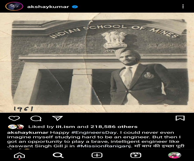 अक्षय कुमार ने अपने इंस्टाग्राम अकाउंट पर जसवंत सिंह गिल की 1961 में ली गई तस्वीर साझा की है। बैक ग्राउंड में इंडियन स्कूल ऑफ माइंस धनबाद है।