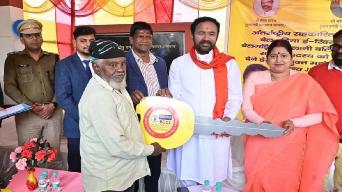 बेलगड़िया में लाभुक को ई-रिक्शा की चाबी प्रदान करते केंद्रीय कोयला मंत्री जी किशन रेड्डी। साथ में सांसद ढुलू महतो और विधायक रागिनी सिंह।