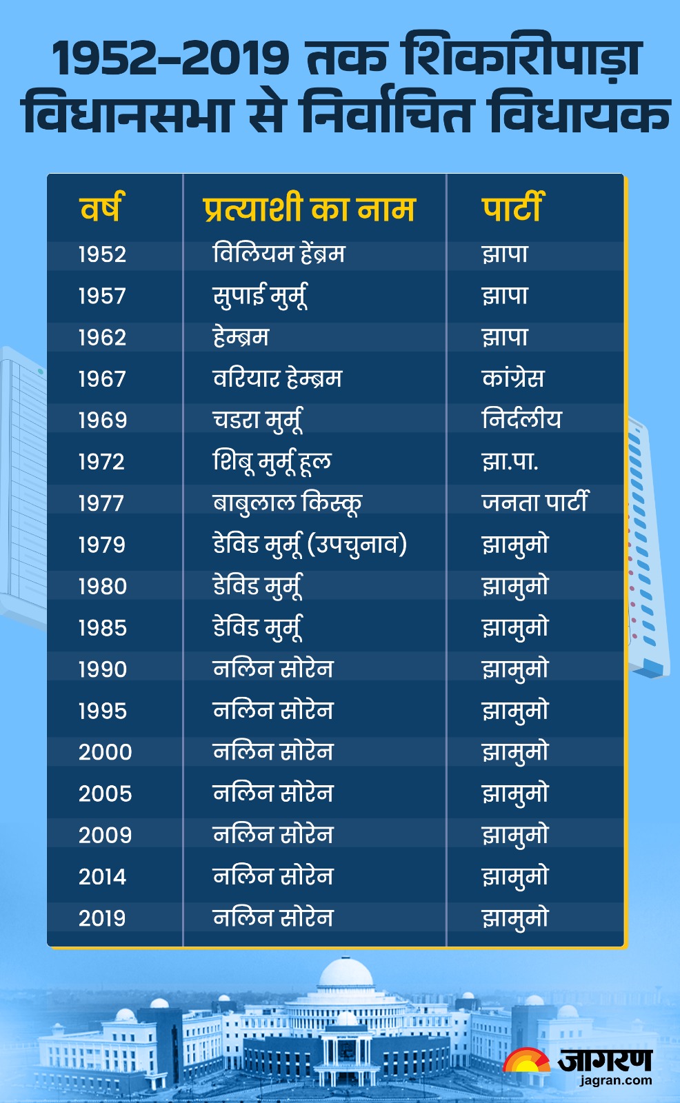 अनुसूचित जनजाति के लिए आरक्षित शिकारीपाड़ा विधानसभा सीट झामुमो का अभेद्य किला है। देश की आजादी के बाद अब तक हुए चुनावों में झामुमो ने सर्वाधिक 10 बार जीत हासिल की है, जिसमें लगातार सात बार जीतने का रिकॉर्ड नलिन सोरेन के नाम पर दर्ज है। आजादी के बाद 1952 से अब तक इस विधानसभा क्षेत्र में उपचुनाव सहित 17 बार विधानसभा के चुनाव हुए हैं, जिसमें सर्वाधिक 10 बार झामुमो के प्रत्याशियों ने जीत हासिल की है।