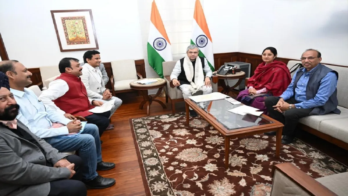 गिरिडीह चैंबर ऑफ कॉमर्स के प्रतिनिधि मंडल के साथ रेल मंत्री अश्विनी वैष्णव से बात करतीं केंद्रीय मंत्री अन्नपूर्णा देवी।