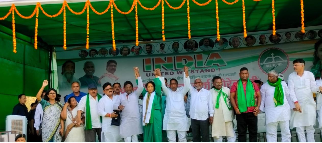 मंच से सभा में इंडी नेताओं के साथ एकता प्रदर्शित करते सीएम चम्पाई सोरेन, प्रत्याशी कल्पना सोरेन व अन्य।