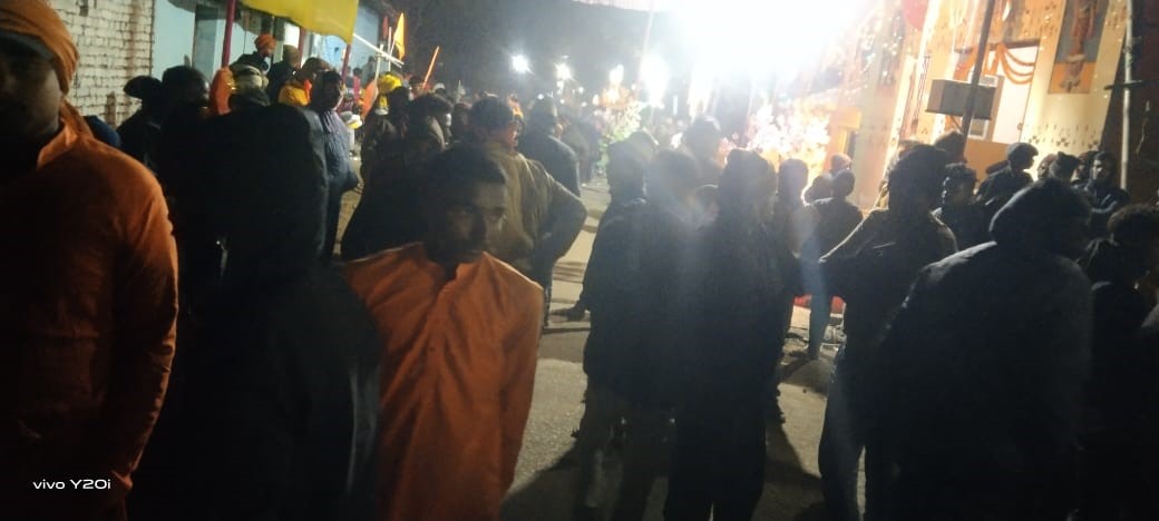 मुफ्फसिल थाना क्षेत्र के पुरना नगर में शोभा यात्रा पर पथराव के बाद अक्रोशित रामभक्त।