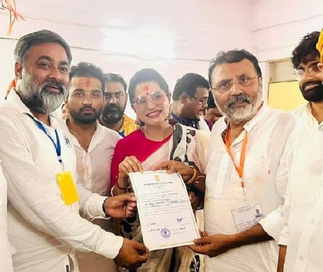 जीत का प्रमाण पत्र दिखाते निशिकांत दुबे व उनकी पत्नी सहित कार्यकर्ता।