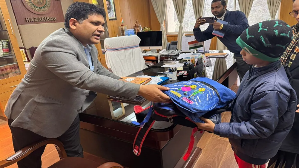 हजारीबाग उपायुक्त ने पीड़ित बच्चे को बैग एवं पठन-पाठन की सामग्री दी।
