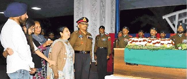 तिरंगे में लिपटे पार्थिव शरीर को सेना के जवान अपने कंधे पर रखकर श्रद्धांजलि स्थल पर लाए। इसके बाद सेना के अधिकारियों ने उनके पार्थिव शरीर पर फूलों का चक्र रखकर सलामी दी।