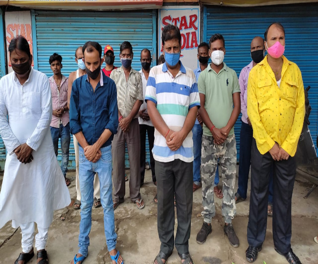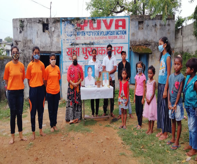 जमशेदपुर के साकची टेंपो स्टैंड में नमन करते लोग।