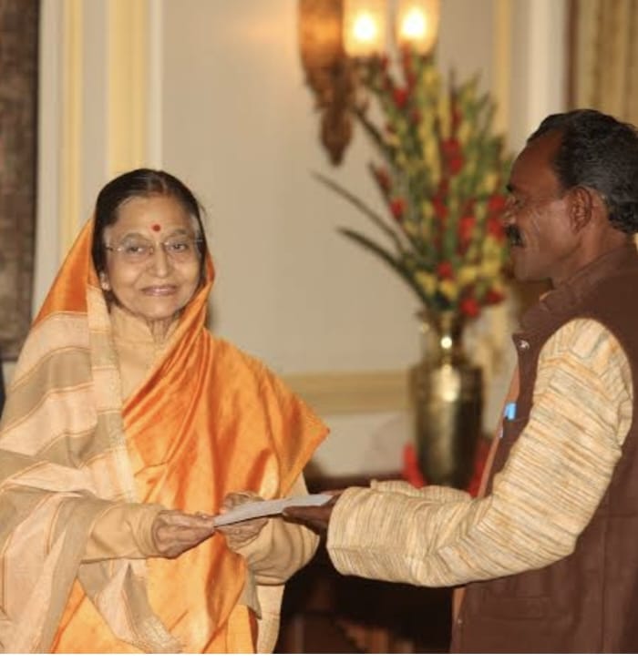 तत्कालीन राष्ट्रपति प्रतिभा देवी पाटिल के हाथों सम्मानित होते कांठा सिंह की फाइल फोटो।