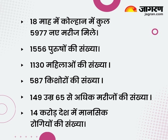नेशनल हेल्थ मेंटल सर्वे के अनुसार, देश में 70 से 80 प्रतिशत मानसिक रोगियों को इलाज नहीं मिल पाता है। कोल्हान प्रमंडल में मानसिक रोगियों के लिए अस्पताल नहीं है। वर्ष 2012 में अस्पताल खोलने का निर्णय लिया गया था, पर अब तक नहीं खुला।