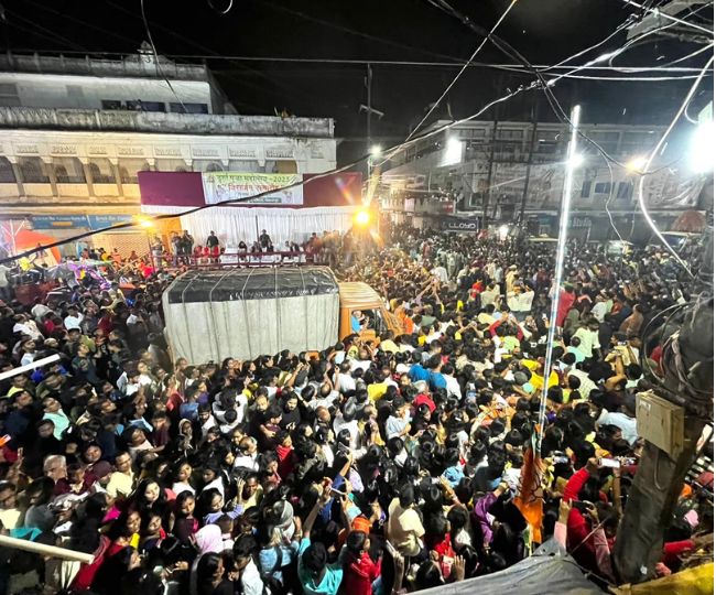 (पवन चौक में मशाल जुलूस को अपने मोबाइल के कैमरे में कैद करते हज़ारो श्रद्धालुओ की भीड़)