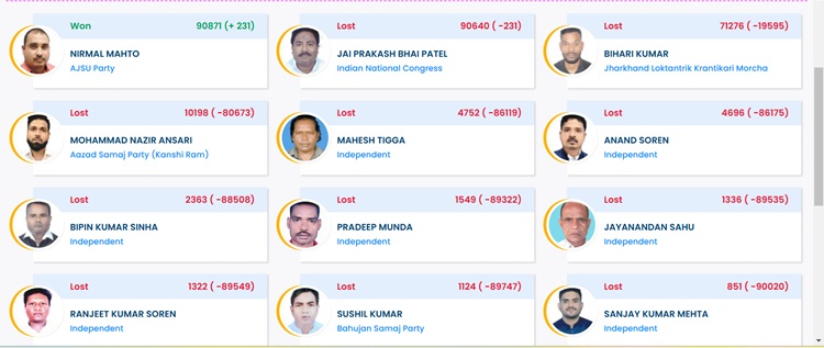 वैसे तो चुनाव के मैदान में कुल 18 प्रत्याशी हैं। लेकिन मुख्य मुकाबला आइएनडीआइए गठबंधन के कांग्रेस के प्रत्याशी जेपी पटेल व एनडीए गठबंधन के आजसू प्रत्याशी तिवारी महतो के बीच मना जा रहा। हालांकि जेएलकेएम के बिहारी महतो ने इसे त्रिकोणीय बनाने का भरपूर प्रयास किया है। जीत का सेहरा किसके सर बंधेगा यह तो 23 को मतगणना के दिन ही पता चलेगा।