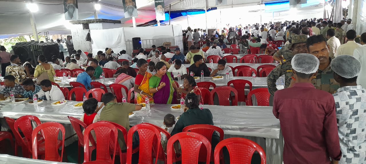 खाने पीने के लिए ढाई पंडाल लगे हैं। एक पंडाल में एक बार में 2500 लोगों के बैठने की क्षमता है। करीब 8000 लोग एक बार में बैठकर संस्कार भोज ले सकता है। सादे लिबास से लेकर वर्दी तक में सुरक्षा बल मौजूद हैं।