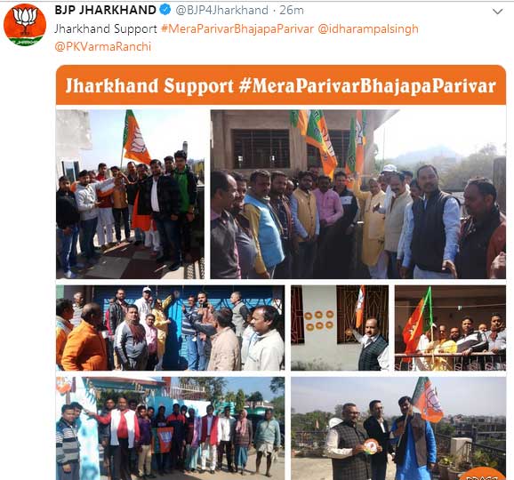 भाजपा के राष्ट्रीय महासचिव अरुण सिंह ने सभी पार्टी कार्यकर्ताओं को अपने-अपने घरों में भाजपा का ध्वज लगाने का निर्देश दिया। 12 फरवरी से दो मार्च तक मेरा परिवार-भाजपा परिवार कार्यक्रम के दौरान सभी कार्यकर्ता अपने-अपने घरों में पार्टी का झंडा लगाएंगे। उन्होंने कहा कि झारखंड की सभी 14 लोकसभा सीटें जीतकर केंद्र में पुन: प्रधानमंत्री नरेंद्र मोदी के नेतृत्व में एक मजबूत सरकार बनानी है। कहा, बूथ स्तर पर कार्यकर्ताओं में आत्मविश्वास है। देश तेजी से प्रधानमंत्री के नेतृत्व में विकास के पथ पर आगे निकल पड़ा है।