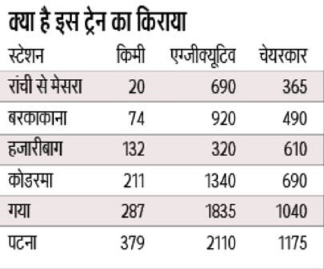 पटना-रांची जनशताब्दी एक्सप्रेस के किराए की तुलना में वंदे भारत ट्रेन का किराया अधिक है। ट्रेन सप्ताह में छह दिन दौड़ेगी। सिर्फ मंगलवार को ट्रेन का परिचालन नहीं होगा। ट्रेन 385 किलोमीटर की दूरी 5.50 घंटे में तय करेगी। जबकि पटना से रांची की दूरी छह घंटे में तय करेगा। अन्य ट्रेनों की तुलना में दो घंटे पहले रांची से पटना के बीच की दूरी को तय करेगी।