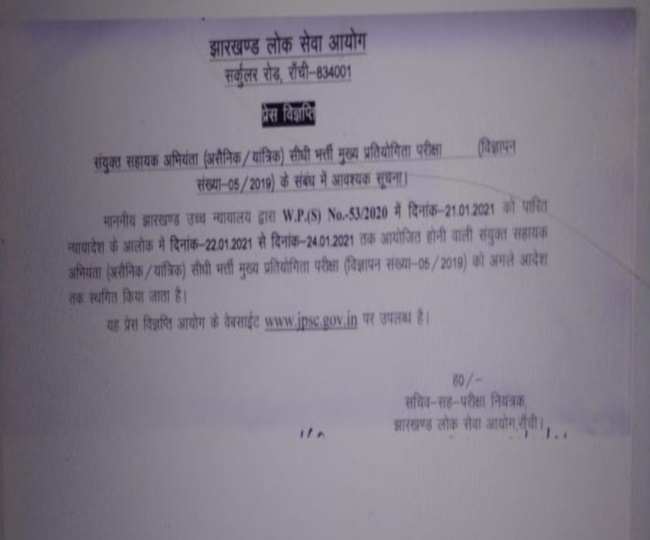 रांची, राज्य ब्यूरो । JPSC AE Exam Cancelled, JPSC AE News, JPSC AE Main Exam Postponed झारखंड लोक सेवा आयोग ने शुक्रवार से शुरू होनेवाली संयुक्त सहायक अभियंता नियुक्ति प्रतियोगिता परीक्षा अगले आदेश तक के लिए स्थगित कर दी है। आयोग ने गुरुवार को ही झारखंड उच्च न्यायालय द्वारा पारित न्यायादेश के आलोक में यह निर्णय लेते हुए इस संबंध में शाम में सूचना जारी की है। शुक्रवार से शुरू होनेवाली यह परीक्षा दो पालियों में 24 जनवरी तक होनी थी। राज्य सरकार के पथ निर्माण विभाग, जल संसाधन विभाग तथा पेयजल एवं स्वच्छता विभाग में सहायक अभियंता (असैनिक एवं यांत्रिकी) के 542 पदों पर नियुक्ति के लिए यह परीक्षा होनी थी, जिसमें प्रारंभिक परीक्षा में उत्तीर्ण अभ्यर्थी शामिल होते।