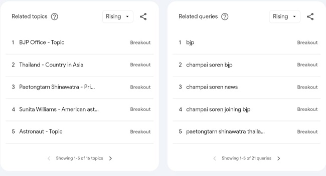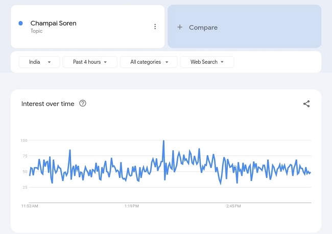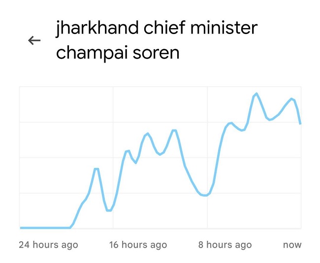 गूगल सर्च ट्रेंड पर गौर करें तो बीते 24 घंटे से चंपई सोरेन (jharkhand chief minister champai soren) ट्रेंड में बने हुए हैं। हालांकि, ट्रेंड का ग्राफ देखने पर पता चलता है कि एक बार सर्च में कमी जरूर आई थी। परंतु, थोड़े समय बाद ही चंपई सोरेन कीवर्ड (jharkhand champai soren) दोबारा से ट्रेंड करने लगा।