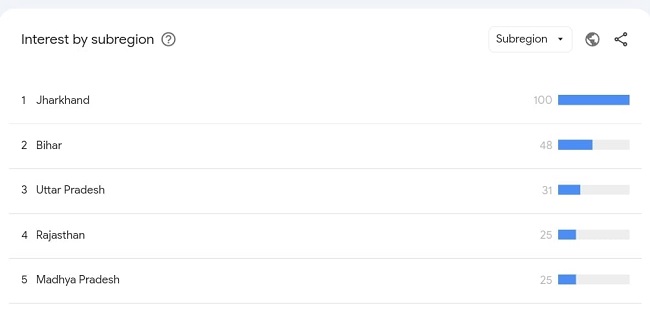 सियासी घटनाक्रम तेज होने के साथ झारखंड भी गूगल सर्च में आ गया। टॉप ट्रेंड की बात करें तो भारत में जिन राज्यों के बारे में सर्च किया जा रहा था, उसमें झारखंड पहले नंबर पर था।