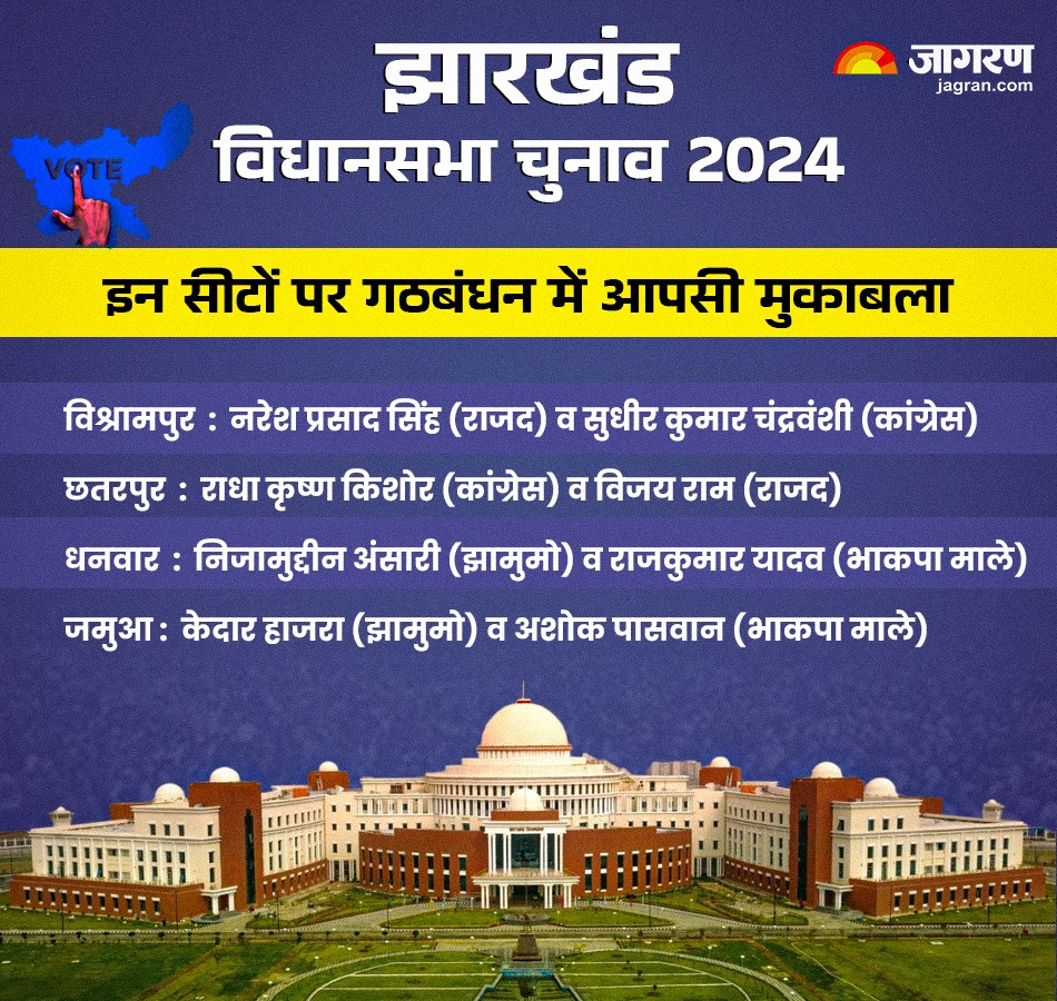 राज्य ब्यूरो, रांची। Jharkhand Election 2024 झारखंड में आईएनडीआईए के घटक दलों में पूरी तरह चुनावी तालमेल धरातल पर नहीं उतर पाया है। इन दलों ने चार सीटों पर एक-दूसरे के विरुद्ध प्रत्याशी भी उतार दिए हैं। गठबंधन में विश्रामपुर सीट राजद के हिस्से में आई थी। कांग्रेस ने भी यहां से सुधीर कुमार चंद्रवंशी को अपना प्रत्याशी बना दिया। इससे नाराज राजद ने कांग्रेस कोटे की छतरपुर सीट पर भी अपना प्रत्याशी दे दिया है।