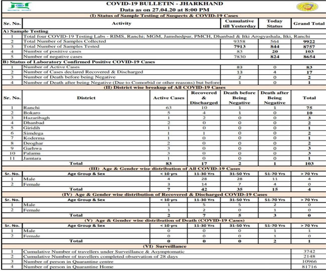 आज के ताजा मामलों को जोड़कर राजधानी रांची में कोरोना संक्रमित मरीजों का आंकड़ा 76 पर पहुंच गया है। जबकि झारखंड के 24 में से 10 जिले कोरोना महामारी की चपेट में आ गए हैं। बीते दिन जामताड़ा में भी एक कोरोना संक्रमित की पहचान की गई थी। राज्य सरकार की ओर से दी गई आधिकारिक जानकारी के मुताबिक सभी कोरोना संक्रमित मरीजों को इलाज के लिए आइसोलेशन वार्ड में भर्ती किया गया है। उनपर सतत निगरानी रखी जा रही है। झारखंड में अबतक 13 कोरोना संक्रमित मरीज स्वस्थ हुए हैं। जबकि दो संक्रमितों की कोरोना से मौत हो चुकी है।