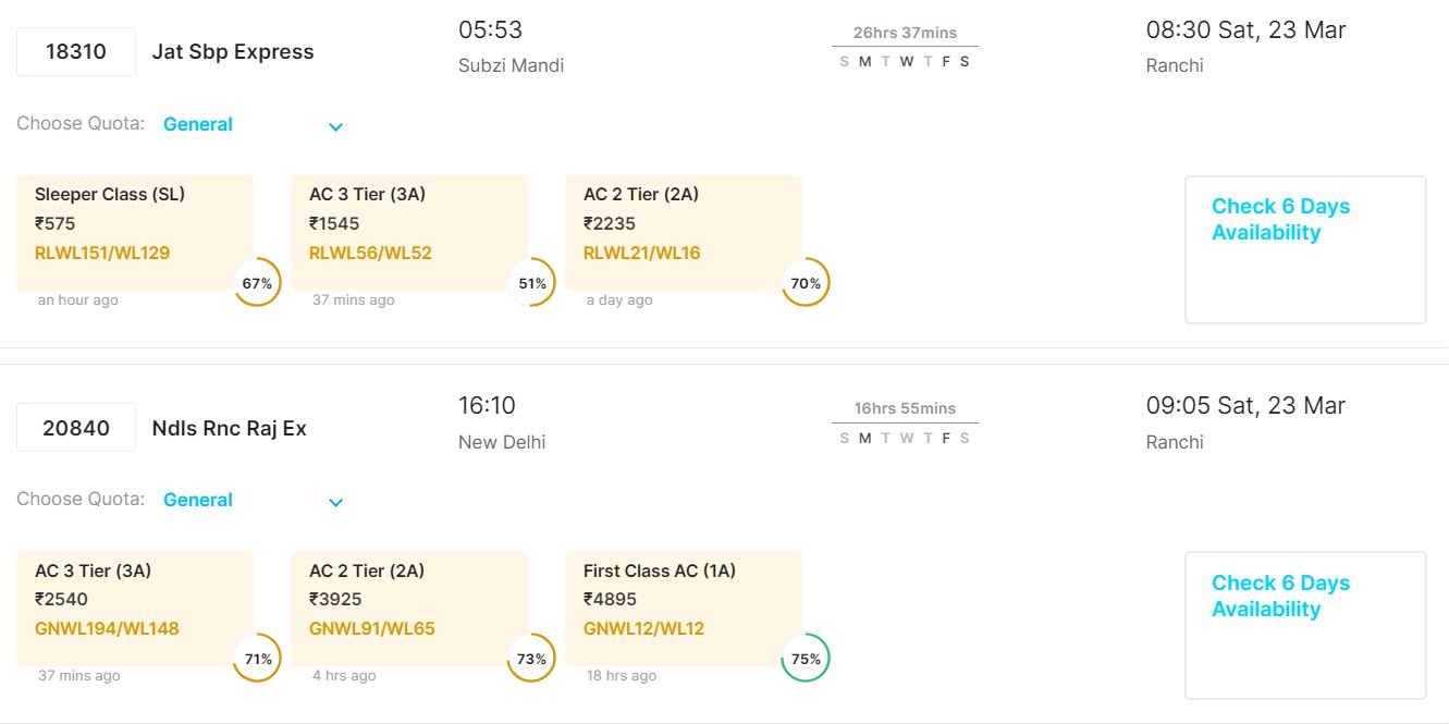 होली का सीजन है। ऐसे में ट्रेनों में धड़ाधड़ बुकिंग हो रही है। इस दौरान दिल्ली से रांची जाने वाली सभी ट्रेनों में अभी वेटिंग लिस्ट के तहत रिजर्वेशन हो रहा है। एक ऑनलाइन प्लेटफार्म से ली गई जानकारी के मुताबिक, जम्मू तवी-संबलपुर एक्सप्रेस के स्लीपर कोच में 129 वेटिंग चल रही है। इसी ट्रेन के 3 टियर में 52 और 2 टियर में 16 वेटिंग चल रही है। बाकी दो ट्रेनों की भी हालत कुछ ऐसी ही है।
