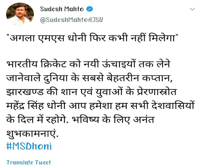 झारखंड की पिछली सरकार में वह किंग मेकर की भूमिका में रहे। वर्तमान में सुदेश रांची के सिल्ली विधानसभा क्षेत्र से विधायक हैं। सुदेश का धौनी के परिवार से गहरा लगाव है। कई मौकों पर दोनों साथ-साथ भी नजर आते रहे हैं। सुदेश ने कहा कि धौनी हमेशा से ही हीरो रहे हैं। भविष्य में भी वह हमारे हीरो रहेंगे।