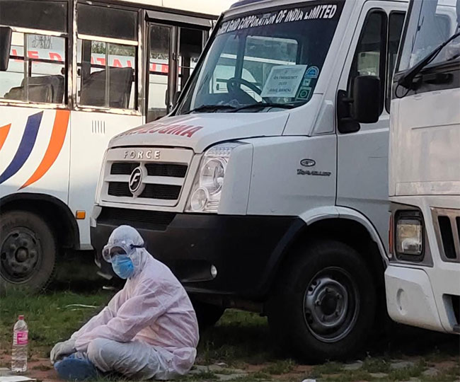 इसी एंबुलेंस में कोरोना मृतक का शव है। एंबुलेंस के बाहर बैठा ड्राइवर।