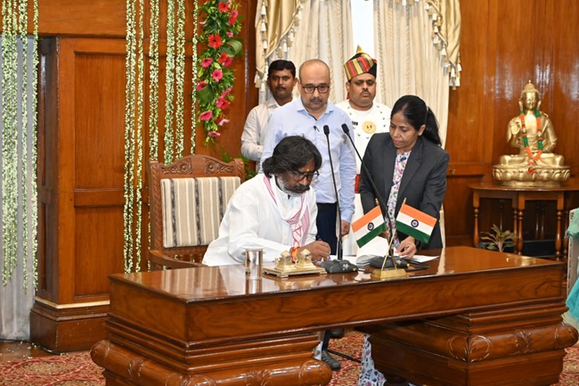 राज्यपाल के समक्ष शपथ लेते हेमंत सोरेन