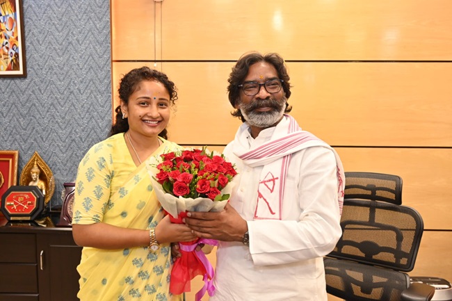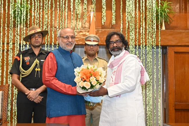 राज्यपाल को गुलदस्ता देते हेमंत सोरेन