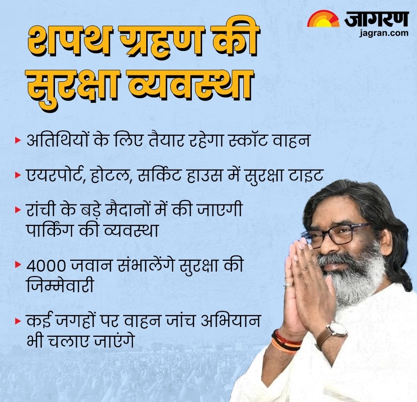 Jharkhand News रांची के मोरहाबादी मैदान में झारखंड के मुख्यमंत्री हेमंत सोरेन के शपथ ग्रहण समारोह की तैयारी पूरी कर ली गई है। समारोह में कई राज्यों के मुख्यमंत्री और वीवीआईपी अतिथि शामिल होंगे। रांची पुलिस और जिला प्रशासन ने सुरक्षा और यातायात व्यवस्था के लिए विशेष इंतजाम किए हैं। रांची एयरपोर्ट होटल सर्किट हाउस में तैनाती के लिए चार हजार से अधिक जवानों की तैनाती होगी।