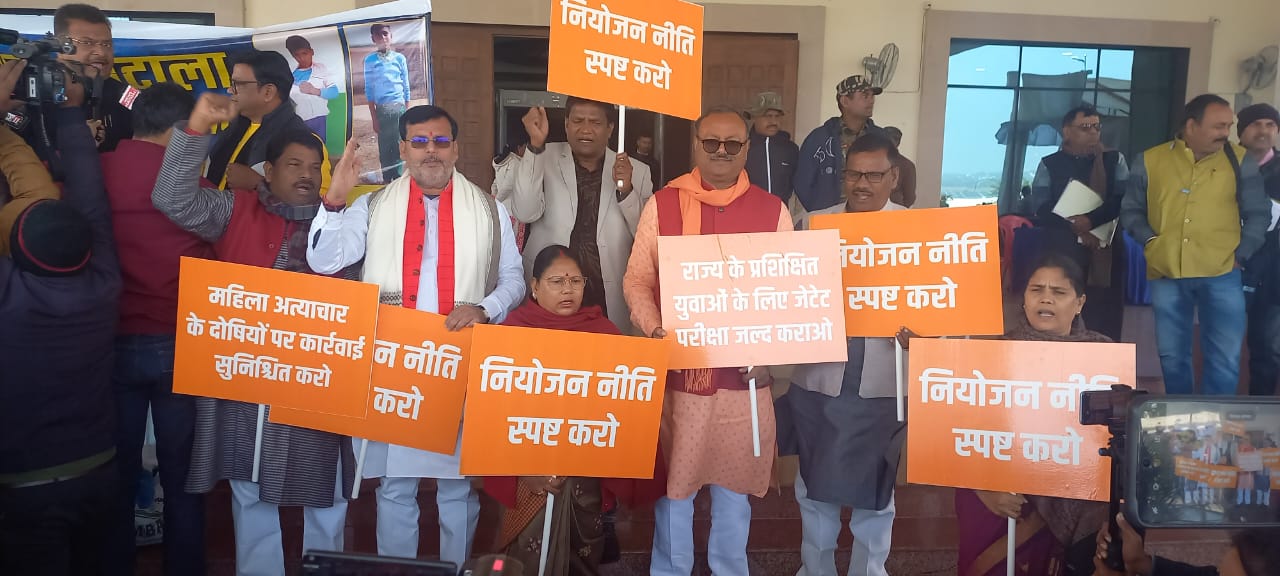 डिजिटल डेस्क, रांची। झारखंड विधानसभा के शीतकालीन सत्र का आज तीसरा दिन है। इस दौरान विधानसभा के मेन गेट पर भाजपा विधायकों ने जमकर प्रदर्शन किया। हाथों में तख्तियां लेकर खूब नारेबाजी की। नियोजन नीति स्पष्ट करो... जैसे नारे लगाए।