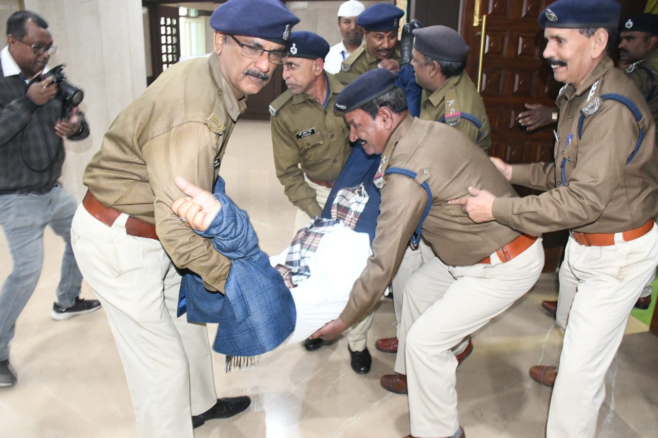 स्पीकर ने भाजपा विधायक बिरंची नारायण और भानु प्रताप शाही को सस्पेंड कर दिया है। दोनों विधायकों को सदन से मार्शलों ने विधानसभा से निकाला। निकालने के दौरान निकास द्वार के पास बिरंची नारायण गिर गए।