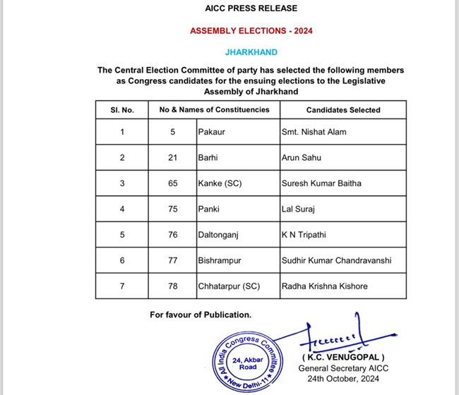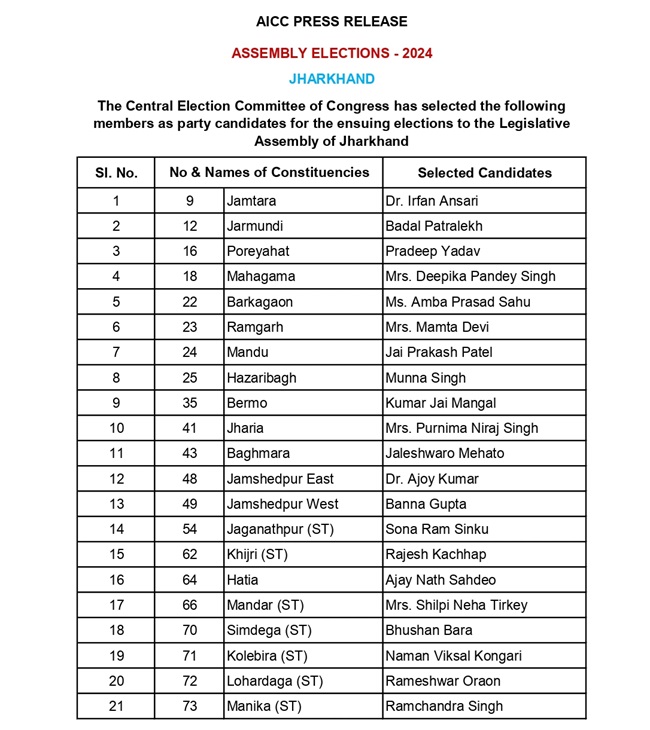 Jharkhand Election 2024: झारखंड में 7 और सीटों पर Congress के प्रत्याशियों का एलान, पढ़ें पूरी लिस्ट यहां