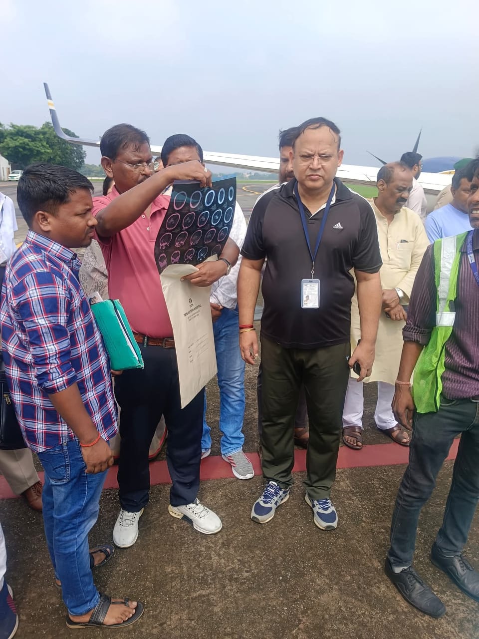 सोनारी एयरपोर्ट पर शिक्षा मंत्री रामदास सोरेन के मेडिकल रिपोर्ट को देखते पूर्व सीएम अर्जुन मुंडा। जागरण