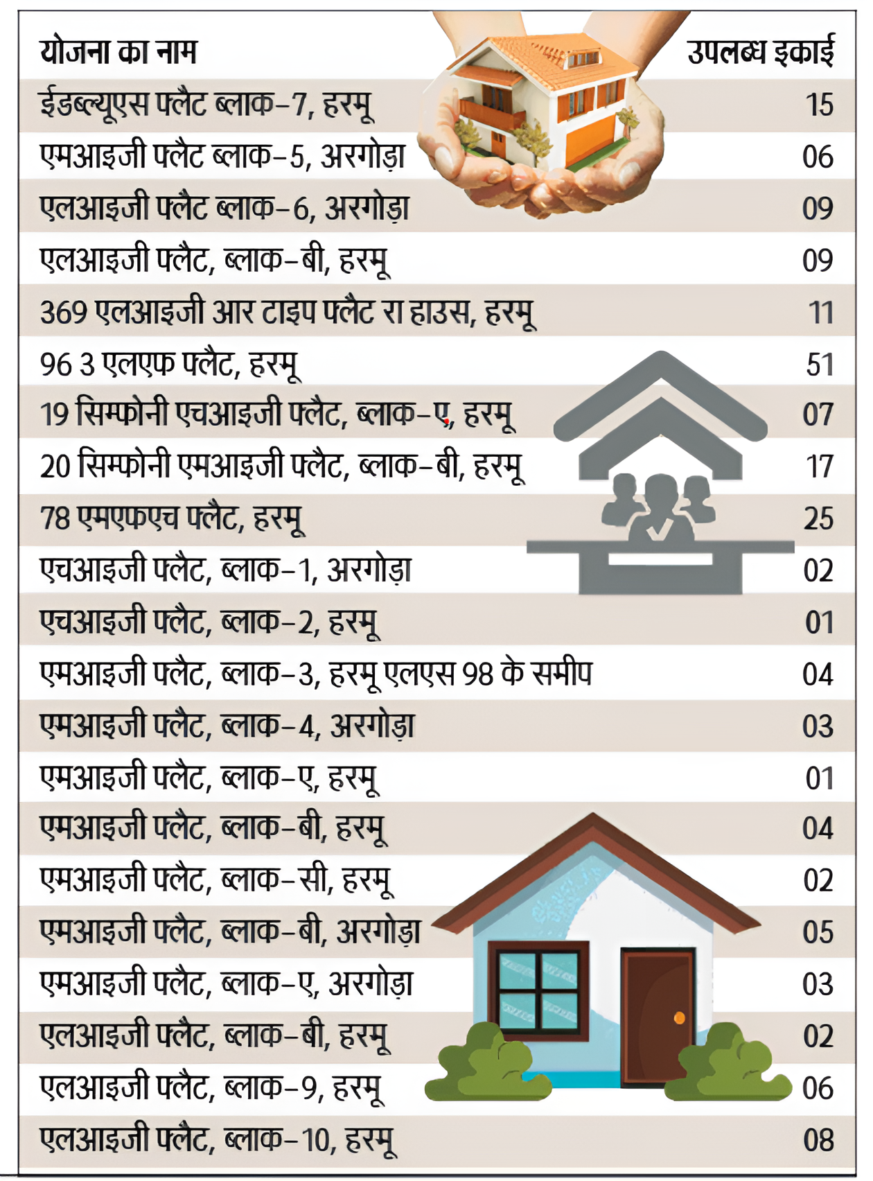 हरमू व अरगोड़ा हाउसिंग कॉलोनी में आवास बोर्ड की ओर से बनाए गए आवास/फ्लैट ई-लॉटरी के माध्यम से आवंटित किए जाएंगे। जल्द ही इसके लिए ऑनलाइन आवेदन लिए जाएंगे। आवास/फ्लैट आवंटन की प्रक्रिया आवास बोर्ड के रांची प्रमंडल से शुरू की जाएगी। इसके बाद अन्य प्रमंडलों में भी ई-लॉटरी के माध्यम से आवास/फ्लैट आवंटित किए जाएंगे। - विनय मनीष आर लकड़ा, सचिव, झारखंड राज्य आवास बोर्ड।