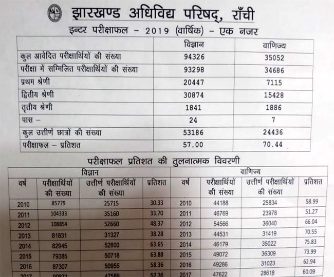 इसी तरह, इंटरमीडिएट कामर्स में 70.44 फीसद विद्यार्थी पास हुए है। पिछले वर्ष 67.49 फीसद रिजल्ट हुआ था। इंटरमीडिएट साइंस के रिजल्ट में वर्ष 2015 के बाद लगातार गिरावट आ रही थी, इस बार इस पर न केवल रोक लगी, बल्कि पिछले दो साल से बेहतर परिणाम हुआ। अपना रिजल्ट यहां देखें - jac.jharkhand.gov.in/jac/ या jac.nic.in या jacresults.com.jpg)