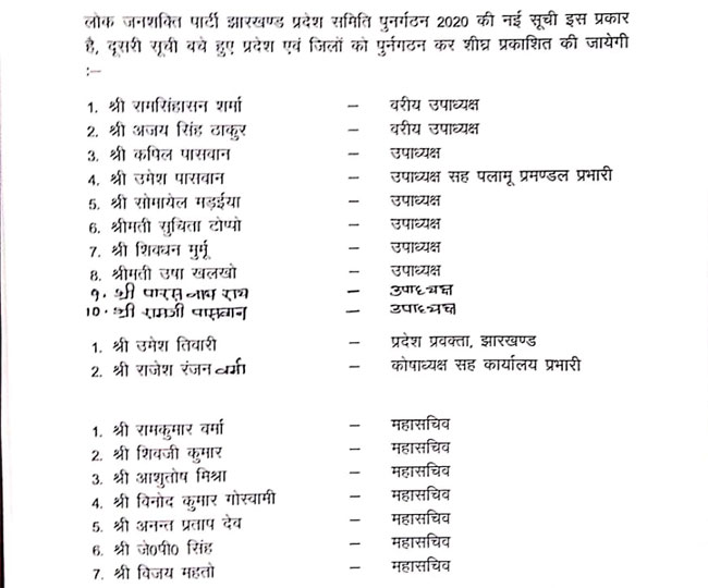 लोक जनशक्ति पार्टी की झारखंड इकाई पुनर्गठित, 10 उपाध्यक्ष नियुक्त Ranchi News