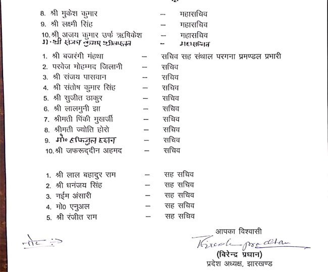 - उपाध्यक्ष : कपिल पासवान, उमेश पासवान (पलामू प्रमंडल प्रभारी), सोमायेल मड़ईया, सुचिता टोप्पो, शिवधन मुर्मू, उषा खलखो, पारसनाथ राय व रामजी पासवान।
