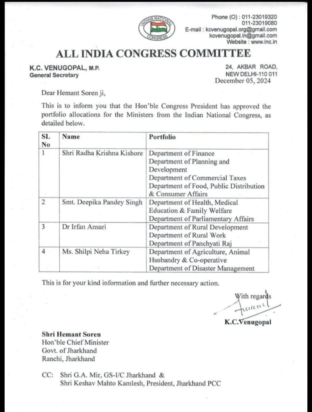 Jharkhand Ministers: मंत्रिपरिषद के बंटवारे से पहले ही लीक हो गई कांग्रेस की चिट्ठी, मिले अहम मंत्रालय