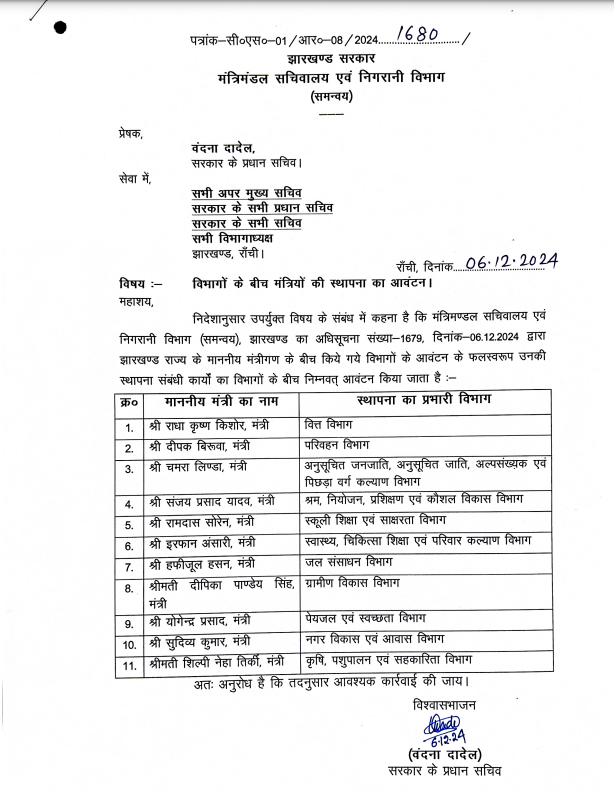 राज्य ब्यूरो, रांची। मुख्यमंत्री हेमंत सोरेन ने शुक्रवार को राज्य मंत्रिपरिषद के सदस्यों के बीच विभागों का बंटवारा कर दिया। पिछली सरकार में जो विभाग आईएनडीआईए के घटक दलों के पास थे, वही विभाग इस बार भी उनके खाते में ही रहे। अलबत्ता मंत्रियों के विभागों में फेरबदल किया गया है। विभागों के बंटवारा होने के बाद कई मंत्रियों ने कामकाज संभाल लिया।
