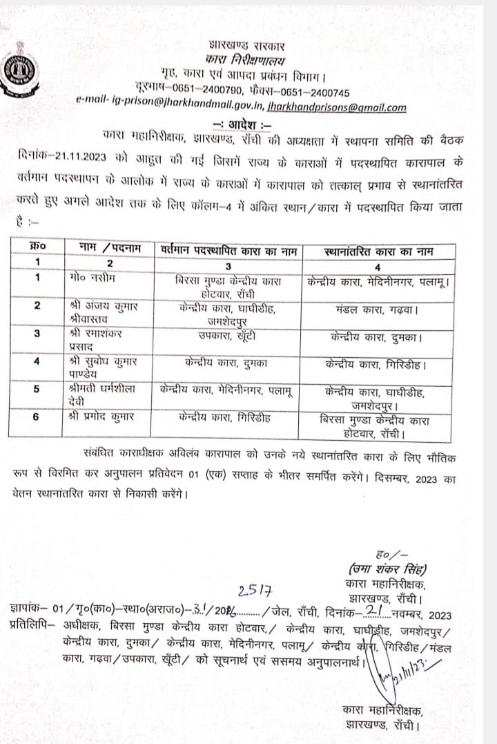 उनके स्थान पर केंद्रीय कारा गिरिडीह के जेलर प्रमोद कुमार को होटवार स्थित बिरसा मुंडा केंद्रीय कारा का नया जेलर बनाया गया है। राज्य के कुल छह जेलर का तबादला हो गया है। आइजी जेल उमाशंकर सिंह ने इससे संबंधित अधिसूचना जारी कर दी है।