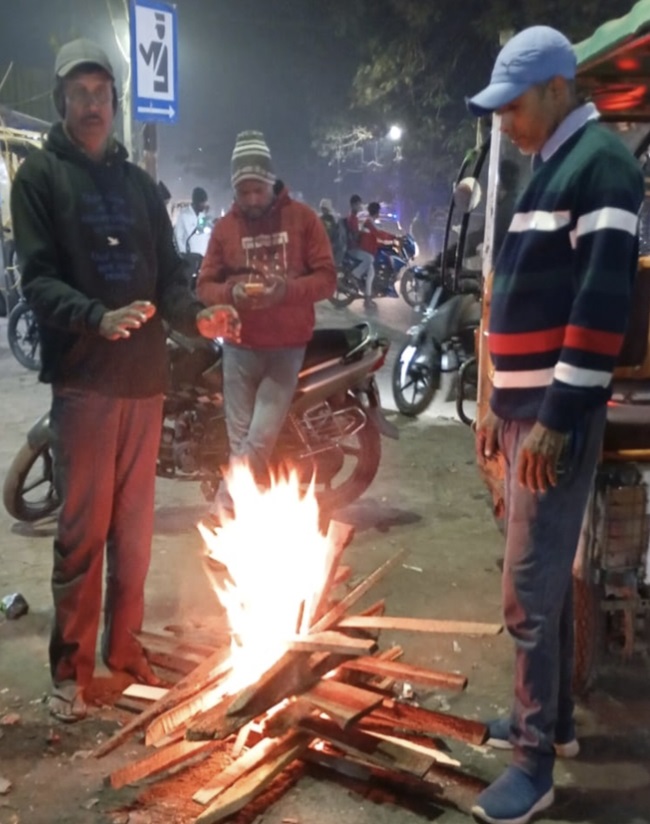 ठंड से बचने के लिए अलाव का सहारा लेते लोग
