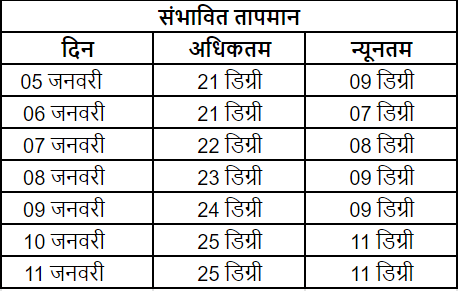 अधिकतम तापमान 22-25 डिग्री सेल्सियस एवं न्यूनतम तापमान 7-8 डिग्री के आसपास बना रहेगा। ऐसे में पूरे दिन लोग गर्म कपड़े पहनने को मजबूर हैं। बता दें कि पिछले तीन दिन से आसमान में बादल रहने के कारण धूप नहीं निकल रही है। दिन में भी घना कोहरा होने के कारण वाहन चालकों को वाहनों की लाइट जलाकर चलना पड़ रहा है। बच्चों और बुजुर्गों का खास ध्यान रखने की जरूरत है।