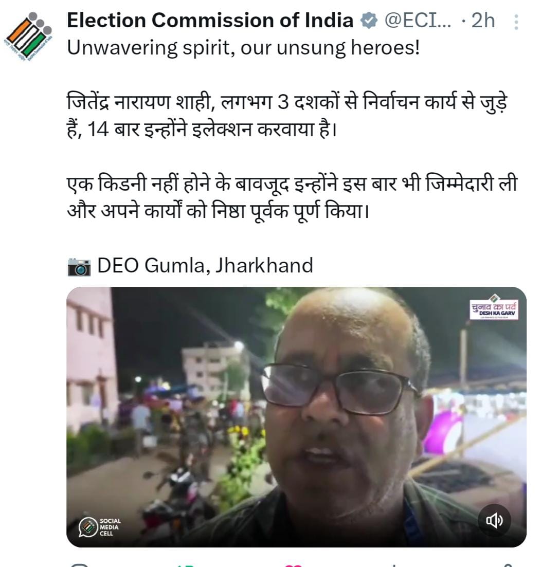 Jharkhand News ऐसे कर्मी हैं जो लगन के साथ चुनाव ड्यूटी करते हैं। ऐसे भी कर्मी है जो अपनी परेशानियों को अलग रखकर लोकतंत्र के पर्व में अपनी जिम्मेदारी निभाते हैं। गुमला के जितेंद्र नारायण शाही उन्हीं कर्मियों में से हैं जिनकी सराहना चुनाव आयोग ने की है। चुनाव आयोग ने एक्स पर पोस्ट कर उन्हें अनसंग हीरोज बताया है।